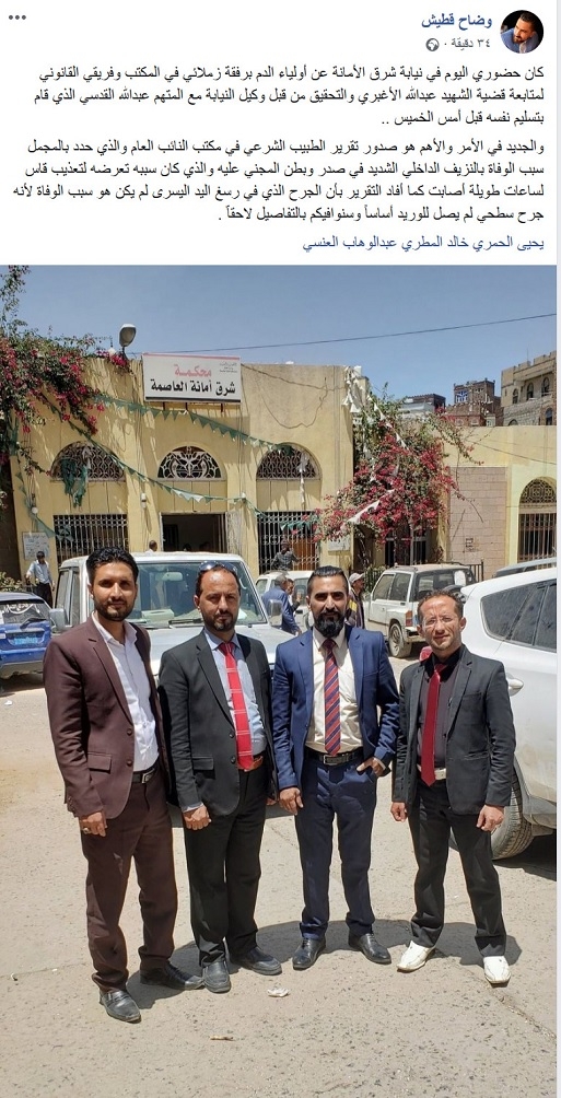 وقال المحامي وضاح قطيش في منشور له على "الفيس بوك " بأنه حضر اليوم الى نيابة شرق الأمانة عن أولياء الدم برفقة زملائه في المكتب وفريقي القانوني لمتابعة قضية الشهيد عبدالله الأغبري.