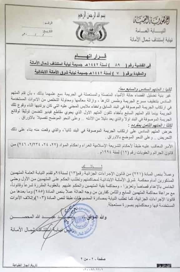 وقد تداولت مواقع إعلامية وثائق لقرار اتهام النيابة الموجهة للمتهمين ، الذين قاموا بتعذيب وقتل المجني عليه عبدالله قائد الأغبري ، في أواخر شهر أغسطس .