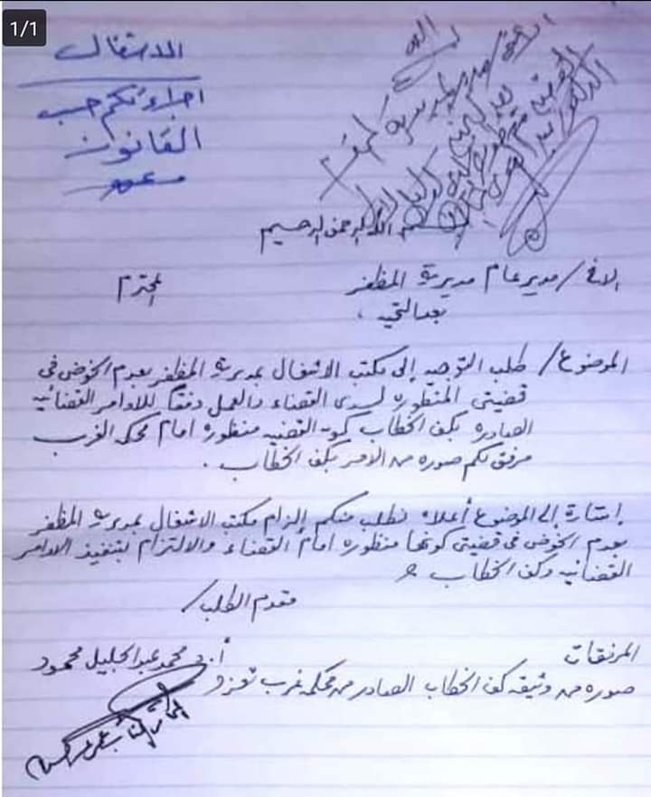 المواطن توجه الى مدير عام مديرية المظفر يطالبه بتوجيه مدير عام الاشغال بالمديرية بتنفيذ توجيهات القضاء وعدم التدخل في القضية.