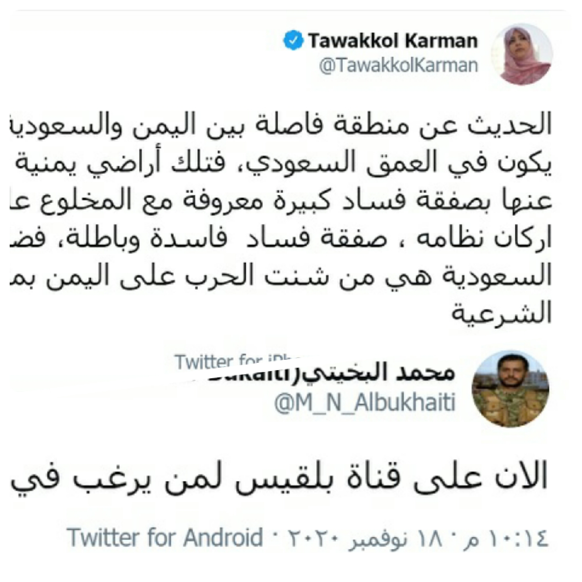 هذا الموقف من توكل كرمان المتطابق مع ما تردده جماعة الحوثي ، يتزامن مع قيام قناة " بلقيس " التابعة لها والمدعومة من قطر، باستضافة القيادي في الجماعة محمد البخيتي.