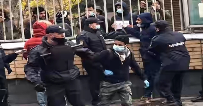 وأقدمت الشرطة الروسية بدوها على اعتقال 15 طالب اثناء إعتصامهم للمطالبة بمستحقاتهم المالية داخل السفارة اليمنية منذ 40 يوماً في موسكو.