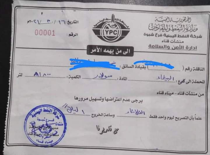 ويشير السند الذي تداوله ناشطون الى تصريح مرور كميات ضخمة من مادة الديزل من الميناء الى مناطق سيطرة مليشيات الحوثي.