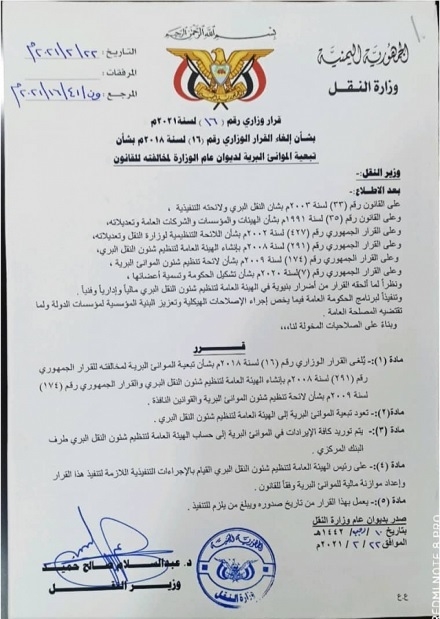وأكد وزير النقل في نص قراره بأن قرار الجبواني مخالف للقرار الجمهوري رقم (٢٩١) لسنة ٢٠٠٨م بإنشاء الهيئة العامة لتنظيم شؤون النقل البري والقرار الجمهوري رقم (١٧٤) لسنة ٢٠٠٩م بشأن لائحة تنظيم شؤون الموانئ البرية والقوانين النافذة.