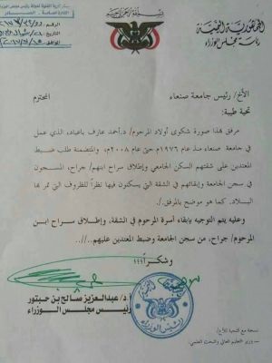 وتؤكد مذكرة أنها موجهة من رئيس حكومة الانقلابيين غير المعترف بها عبدالعزيز بن حبتور، إلى رئيس جامعة صنعاء المعين من قبل الحوثيين فوزي الصغير، وجود سجن في الحرم الجامعي.