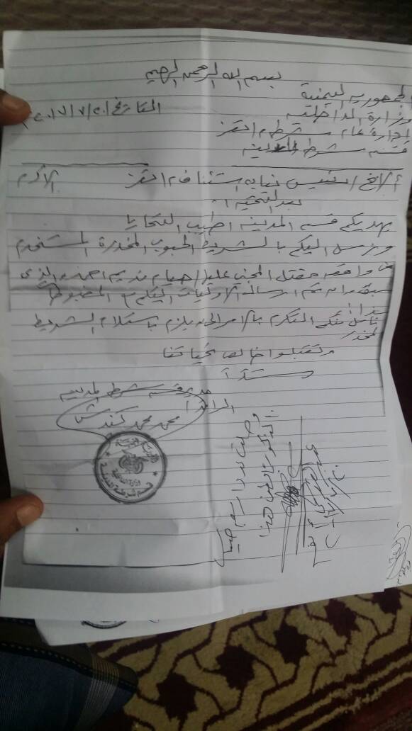 وبحسب الوثائق التي حصل عليها " الرصيف برس " فقد وجه القسم خطابا الى رئيس نيابة استئناف تعز لاستلام ما تم تحريزه من أدلة متعلقة بالجريمة التي وقعت قبل نحو شهر.