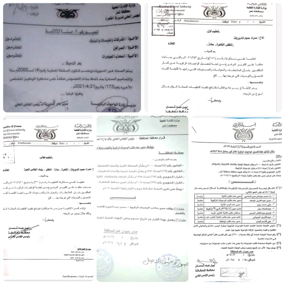 وهو ما كشفته وثائق حصل عليها "الرصيف برس" بقيام مديريات المدينة "صالة والقاهرة والمظفر" بتحصيل هذه الزكوات بأوامر من الوكيل جامل وبالمخالفة رغم اعتراض مكتب الواجبات الزكوية في المحافظة وكذا مكتب الشئون القانونية الذي اكد بان هذا الأمر من اختصاص المكتب بالمحافظة "الإدارة العامة" وليس من صلاحيات الإدارات في المديريات.