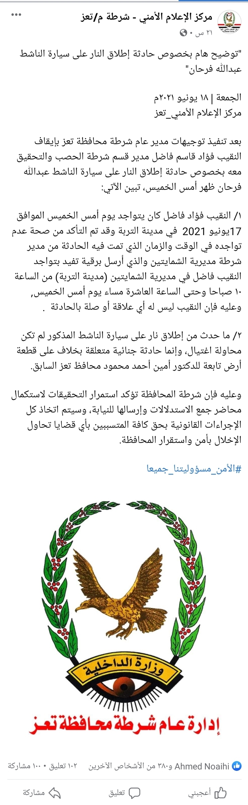 وصفه بـ"شهادة زور" .. فرحان يرد على بيان أمن تعز عن محاولة اغتياله