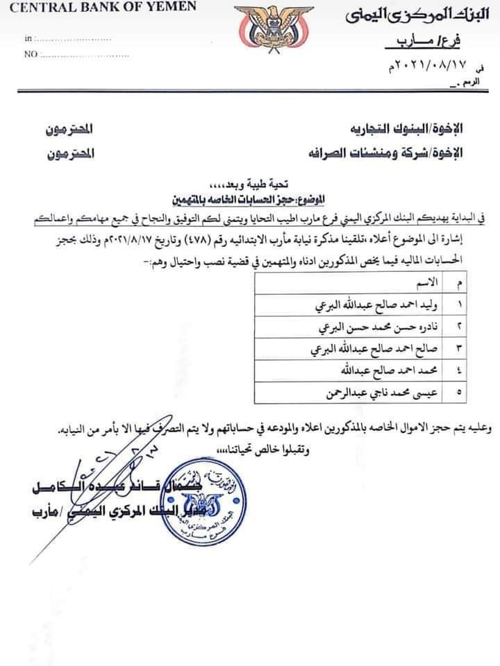 وافادت المذكرة، أن توجيه البنك المركزي، جاء بناءً على مذكرة من نيابة مأرب الإبتدائية، اتهمت فيها الخمسة الأشخاص بالنصب والإحتيال.