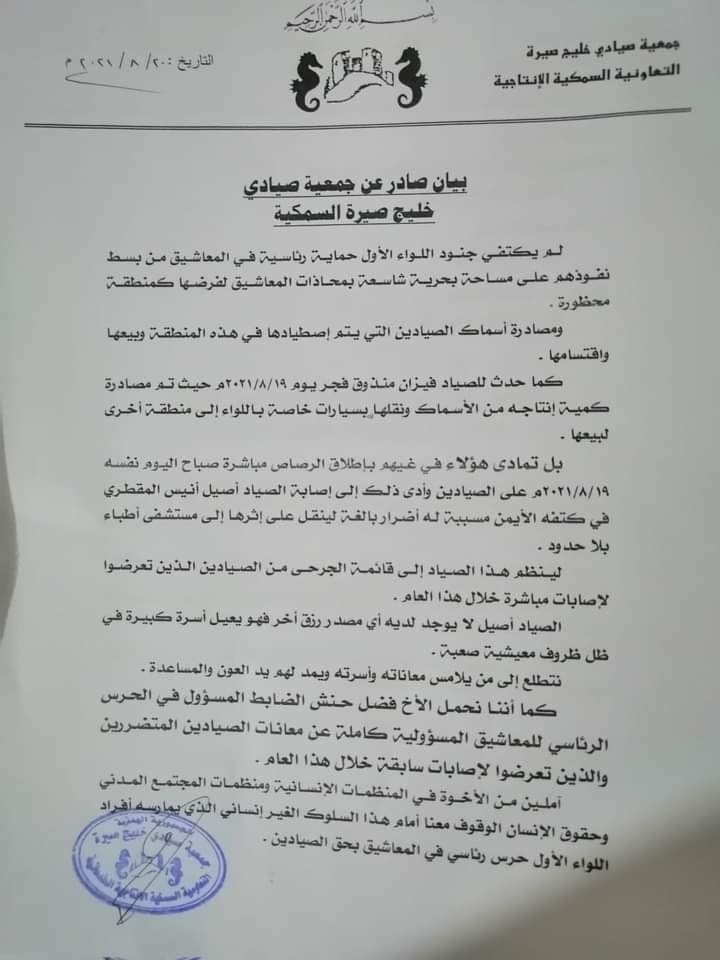 كشفت جمعية صيادي خليج صيرة التعاونية السمكية بمدينة عدن، عن تعرض صيادين لإطلاق نار مباشر ومصادرة الأسماك من قبل قوات تابعة للشرعية تتواجد في قصر المعاشيق. قالت الجمعية -في بيان لها صادر الجمعة- إن صيادين يتبعون الجمعية تعرضوا إلى إطلاق نار مباشر، ومصادرة كميات كبيرة من الأسماك التي بحوزتهم من قبل قوات اللواء الأول حماية رئاسية في قصر المعاشيق. مشيرة في بيان لها بأن قوات اللواء لم تكتفي من بسط نفوذها على مساحة بحرية شاسعة بمحاذاة قصر المعاشيق لفرضها كمنقطة عسكرية محضورة ، ومصادرة أسماك الصيادين التي يتم اصطيادها في هذا المنقطة وبيعيها واقتسامها. مضيفة في بيانها الى ما تعرض له الصياد فيزان يوم الخميس الماضي من مصادرة كمية انتاجه من الأسماك ونقلها بسيارات خاصة باللواء الى منطقة أخرى لبيعها. ولفتت الجمعية الى ما قام به افراد اللواء من اطلاق الرصاص الحي في اليوم ذاته على الصيادين ، ما أدى الى إصابة الصياد أصيل انيس المقطري في كتفه بإصابة بالغة نقل على أثرها للمستشفى للعلاج. وحملت الجمعية فضل حنش الضابط المسؤول في الحرس الرئاسي للمعاشيق، المسؤولية الكاملة حول ما تعرض له الصيادون من أضرار نتيجة تلك الممارسات غير الإنسانية والمستمرة بشكل متكرر. وناشدت الجمعية جهة الاختصاص ومن يهمه الأمر للتدخل في إنهاء تلك الممارسات التي قال بانها أثرت على عمل الصيادين وممارستهم مهنة الصيد التقليدي في البحر، بينما تعرض البعض منهم لإصابات بالغة نتيجة تعرضهم لإطلاق نار مباشر أجبروا بسببه على التوقف عن مزاولة مهنة صيد الأسماك.