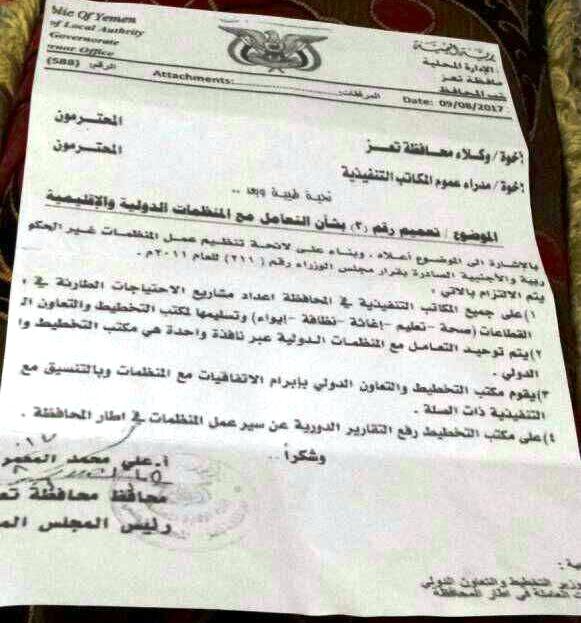 قال المكتب الإعلامي لوكيل المحافظة رشاد الأكحلي،أنه صادف تعميماً صادر عن محافظ المحافظة، علي المعمري، تم تداوله بمواقع التواصل الاجتماعي ويتضمن التعميم طلب من المنظمات الخارجية العاملة في المجال الإغاثي أن تتعامل عبر "مكتب التخطيط"، ويمثله نبيل جامل كما يزعم ويشيع البعض.