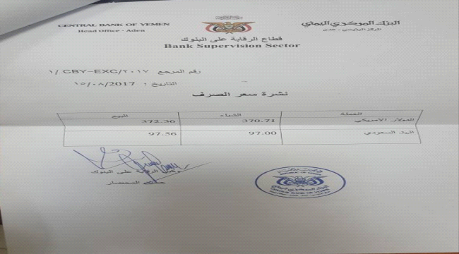 البنك المركزي بعدن يصدر قراراً بتعويم العملة المحلية ، ويحدد سعر الصرف لليوم