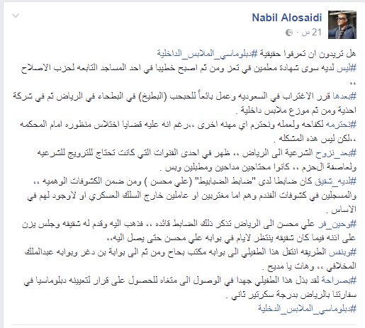 مشيرا الى ان المذكور انتقل الى الرياض للعمل في مهنة بيع الملابس ، وبسبب علاقته اخيه الضابط مع علي محسن تم استصدار له قرار بتعيينه دبلوماسيا في سفارتنا بالرياض بدرجة سكرتير ثاني .