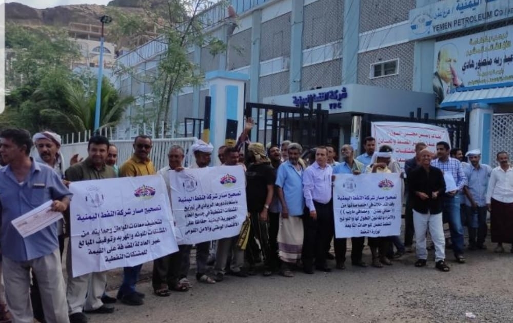 نظم العشرات من مرظقي شركة النفط اليمنية بعدن، صباح اليوم الأحد ،وقفة احيجاجية امام م ...