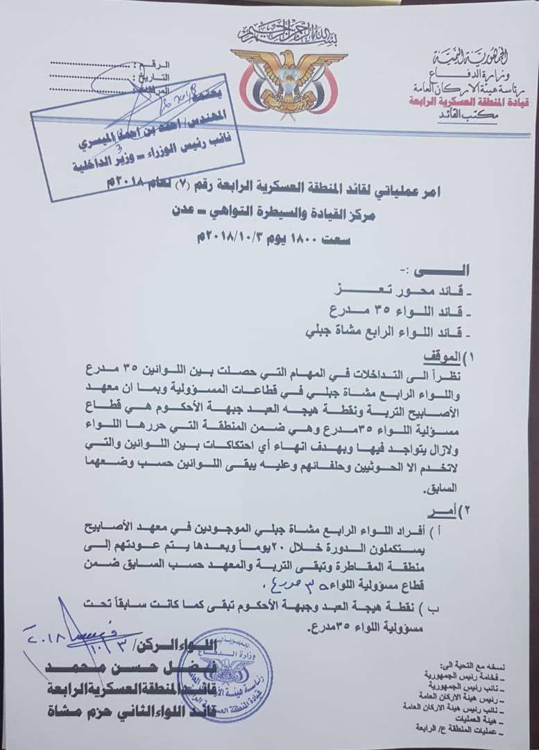 أصدر قائد المنطقة العسكرية الرابعة اللواء فضل حسن أمرا عملياتيا إلى قائد محور تعز وقائد اللواء 35 ...