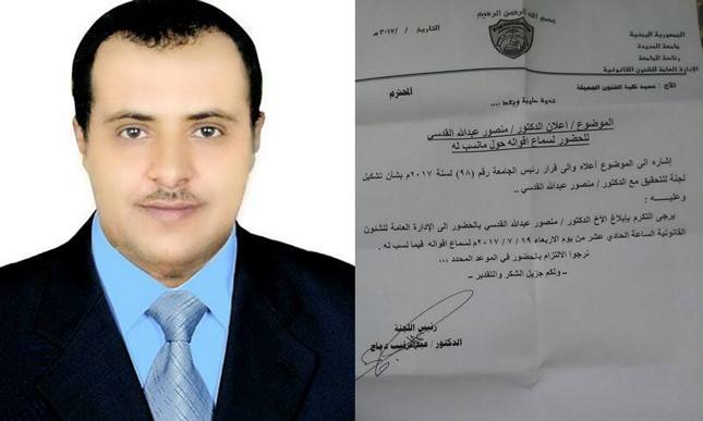 كشف احد اكاديمي جامعة الحديدة تقليه تهديدات بالتصفية على خلفيه نشاطه النقابي داخل الجامعة. ...