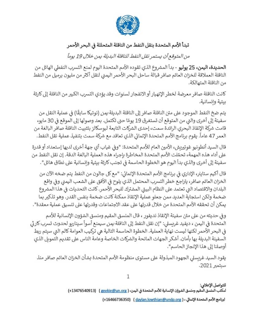 أعلنت الأمم المتحدة اليوم الثلاثاء بدء عملية نقل النفط من الخزان المتهالك "صافر" الى ناقلة النفط الب ...